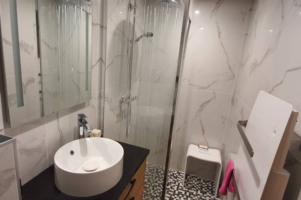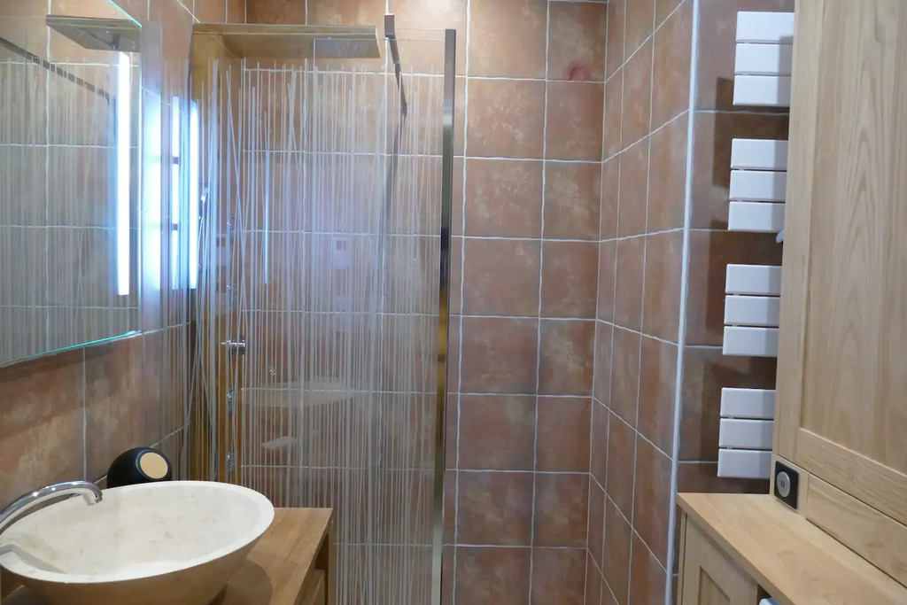 Deux salles d’eau spacieuses équipées d’un sèche-serviettes, d’un lavabo et d’une grande douche à l’italienne.